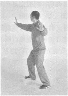 动作6:右手自右肩前经右口角往左前方推出,臂略弯曲,左手仍扶于右 腕处;同时右足全足着地,重心移至右足;左足跟步与右足相齐;眼看右手 (图 41)。