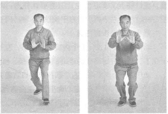 动作5:动作不停,右 足直着往前迈出一步,左足 跟步至右足内踝侧后,足掌 着地。同时右手握拳拳心向