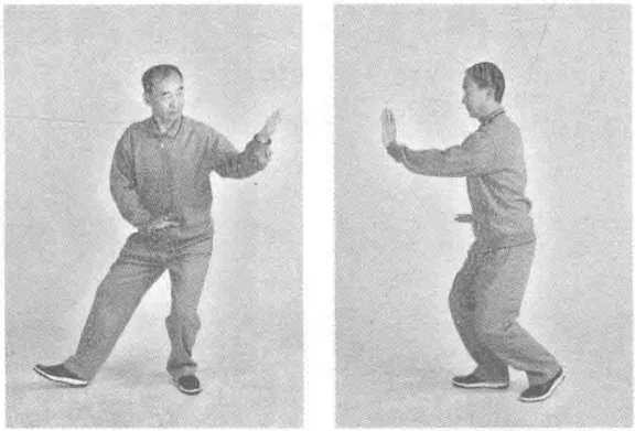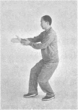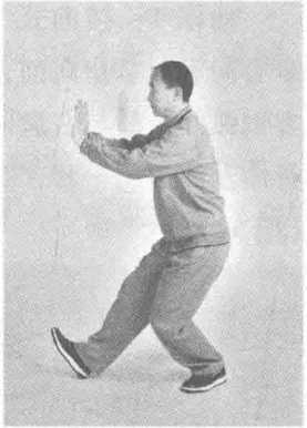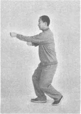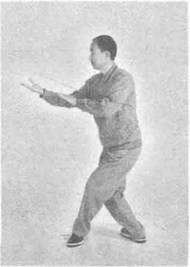 直,虎口朝上,掌心向左,向前平直伸出;两手间横向相距约二寸,右手在 前,左手在后,左手指尖对右手腕纹线;两肘下垂;目视前方(图24)。