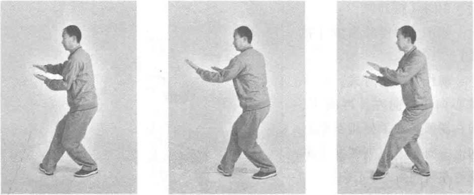 图20 图21图20 图21图22图22图23图23动作2:身体右转,左手变立掌经左口角向右前方 平直推出,掌心向前,掌指向上,臂略曲,塌腕;右 手同时向右搂至右胯外侧,大拇指距右胯一二寸许; 同时右足落实,重心移至右足;左足跟步至右足内踝 侧后三寸许,足掌着地;眼看左手食指尖(图23)。