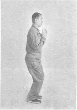 动作1:两手同时撤回胸前,肘尖靠肋,两手掌 指向上,掌心相对,相隔与脸同宽(图42)。