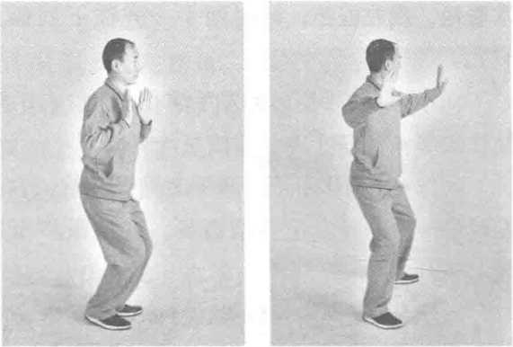 动作4:动作不停,两手上提至胸前,右手扶在左手腕上一齐向前推出, 左臂微伸;同时左足往前迈步,右足跟步至左足内踝侧后,足掌着地(图 39)。