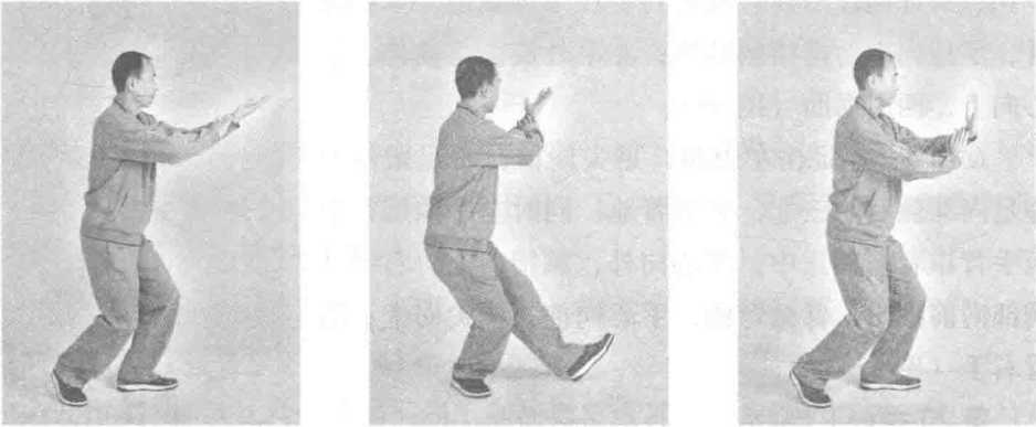 动作1:接前式,左足往前上步落于右足前,足尖正直;随即右足跟步, 至左足内踝侧后,足掌着地;右手扶着左手腕一同向前推出(图51)。