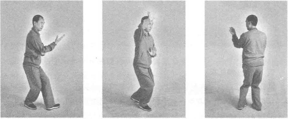 动作2:右足后撤半步,足掌先着地,然后全足落实,身体重心移至右 足,左足尖翘起;同时左手变为掌心向上,平着向左向后划弧至左肩前;右 手仍扶左腕,两臂微弯曲;同时左足着地落实,右足跟步至左足内踝侧后三 寸许,足掌着地;眼看左手食指(图53)。