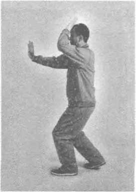 四、左足全足落实,重心移向左足,右足尖 里扣,身体向左后转;同时右手往下至胸前,掌心向 外,掌指向上,拇指侧贴胸;左手外旋微往前伸,手 心向上,两肘靠肋(图56)。动作4:左足往左迈步,足尖向前;右足跟步至 左足内踝侧后约三寸,足掌着地;同时左手内旋往上 至手背靠着前额正中,掌心向外,掌指向上;右手从 胸部向前推出,臂微弯曲,手心向前,指尖向上;眼 看右手(图57) o第20式:下势四、左足全足落实,重心移向左足,右足尖 里扣,身体向左后转;同时右手往下至胸前,掌心向 外,掌指向上,拇指侧贴胸;左手外旋微往前伸,手 心向上,两肘靠肋(图56)。动作4:左足往左迈步,足尖向前;右足跟步至 左足内踝侧后约三寸,足掌着地;同时左手内旋往上 至手背靠着前额正中,掌心向外,掌指向上;右手从 胸部向前推出,臂微弯曲,手心向前,指尖向上;眼 看右手(图57) o第20式:下势图57图57动作1:接前式°右手抽回至右胯侧;左手向前推出,掌心斜向下(左手 推掌动作与搂膝拗步推掌动作相似);在两手动作的同时,右足略向后撤步落动作1:接前式°右手抽回至右胯侧;左手向前推出,掌心斜向下(左手 推掌动作与搂膝拗步推掌动作相似);在两手动作的同时,右足略向后撤步落|孙式太极拳剑精练