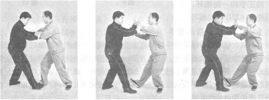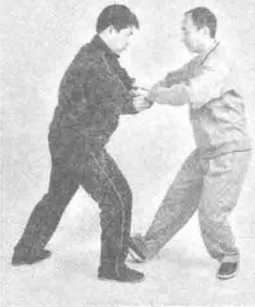 甲左臂承接乙的按劲,以左手手背搠住乙的左手,右臂下旋,右手托起 乙的左肘,同时重心后坐,前脚尖翘起。乙左手被甲托起后,顺势重心前移, 左手掌心向里,右腿微弓,向甲面前搠出(图6) 0
