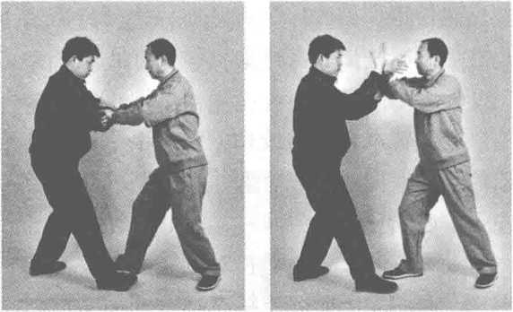 乙即顺甲之势,曲臂横肘,将左手腕里裹,使左 手掌心向里,同时右手抽回,掌心向里插进左臂内 侧,向左微转腰,两臂相叠向甲胸部挤去;眼看对方 眼睛(图8)。