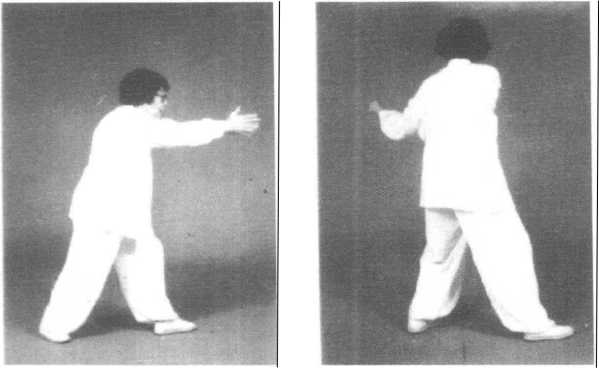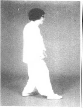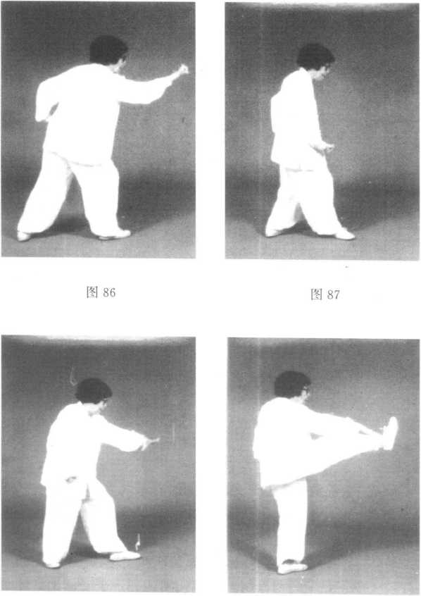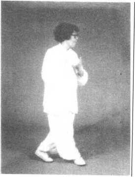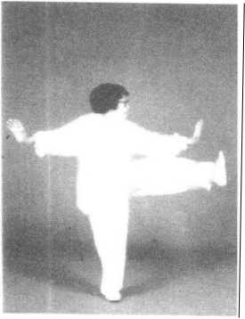 腿略抬起.足尖外摆斜着落地;左膝微屈靠近右腿内侧,足尖着 地;两腿弯曲;眼看前方,微停(图93)。