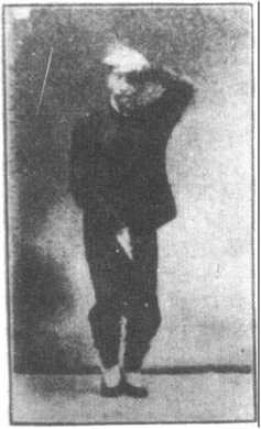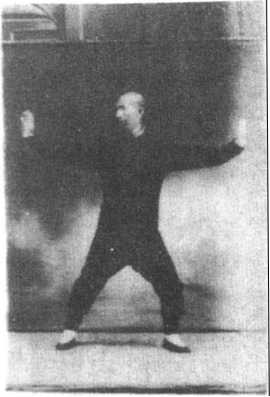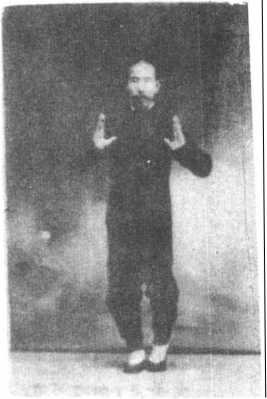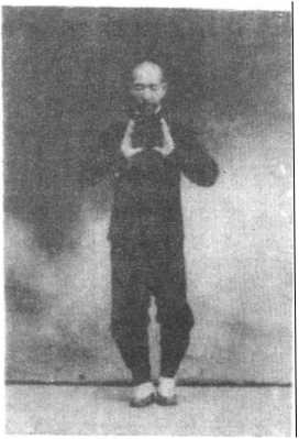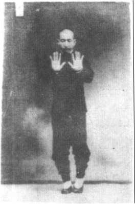再将左手从头部往下落,落 至心口下边,肘靠着胁,大指根 靠着腹.停住。右手腕往外扭, 扭至手心朝外,从小腹处与左手 同时,自左手外边往上起,起至 头部,手背靠着天庭处。右足与 两手同时往前迈步,足后跟着 地。两足之距离,在自己酌定。 右足落地时,身子直着,不能移 动重心为至善处。腰塌住劲,两