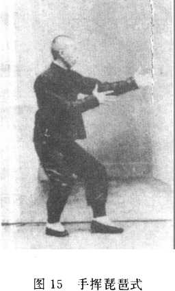 先将两手五指俱伸直,手虎口朝上着,右足即速再往后撤步, 足尖着地,撤步之远近,不移动重心为至善处。随即将右手往回 拉,拉至心口前停住。左手与右 手往回拉时,同时往前伸去至极 处。左足亦同时往后撤,撤至右 足前边,足后跟与右足相离半寸 许.足尖着地,停住。右足后跟, 亦与左足往回撤时着地。惟是身 子往回撤时.神气稳住,不偏不 倚,腹内松静.周身轻灵,如同 悬空之意。内外要一气着往后 撤,不可散乱.练者宜深思之 (见图15)。