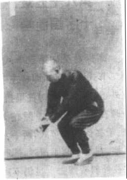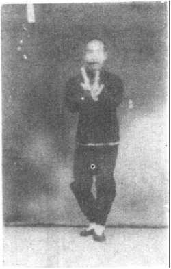 先将左足极力往后撤,右足尖欠起。两手于左足撤时-同时 往回来,随即再往前推出去。左足再于两手推出时,同时跟步。两 手往回来,及推出去,并跟步,一切之形式,.均与第三章懒扎衣 第五节式相同(见第三章第五节懒扎衣图7):
