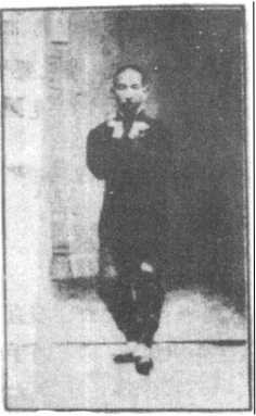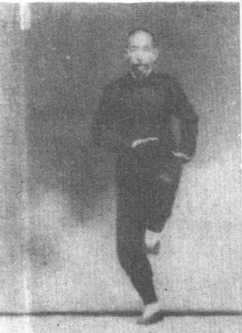 往后来,足尖着地,足后跟离右 足寸许。右手往下按时,身子同 时往下曲腿塌腰。再右手心仍朝 下着。即速往上起,起时如同按 着大气球,往上鼓起之意。左腿 于右手起时,同时极力往上抬 起,足尖仰着,身子与手足亦同 时往上起,全身亦如同按着气 球,往上起之意,式微停(见图 52)。