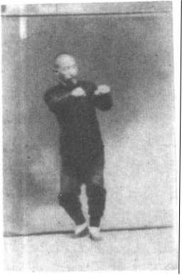 先将左足极力往前直着迈去,足后跟落地。再将两手轻轻卷 上拳,手背朝上着,于左足往前迈时.同时用意拉回胸前一二寸