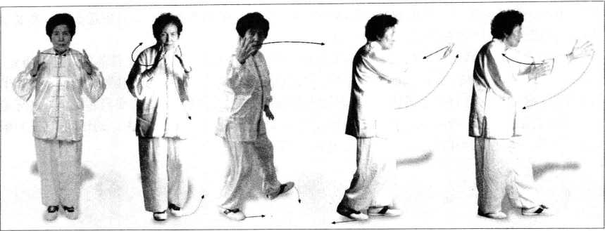 动作的关键在于三通背(左手在前)后转,变为右手在前的过程,两手要如托住重物向自己 的身后捋,但不是用手向后拉,而是舍己从人用身体找手,同时身体向右转180度,转动要灵活, 总要两腿弯曲着。身体的运动方向和手的运动方向不同,就好似是从自已的手下钻过去一样,此 式几节要一气呵成,不可滞涩。