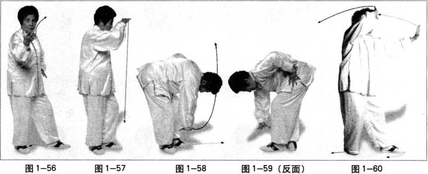 1 .先将右手往后划一弧线,划至头顶不停,再从头顶处往下按,按至两腿当中,离地7寸 许,停住,当右手往后划时,左手同时回抽至左胯上左胁下,手心朝里靠住。左足于右手下按 时,同时后撤,撤至两足跟似挨末挨之意,足后跟欠起,足尖着地。两腿微屈,眼看右手食指根 节。(图 1—56~ 图 1—58)、(图 1-59 反面)