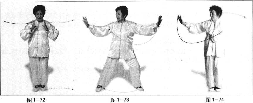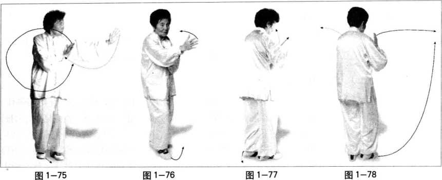 地,右足与右手划时,同时向左迈步,足尖仍向左斜点落地,两足相离2~3寸许。再右手往右 边划上弧线,左足再往左迈步之形式均如前,惟左足落地之远近,随人之高矮不移动重心为至 善。两手两足循环不已,数之多少自便,但须云至左边时接下式。(图1-75)