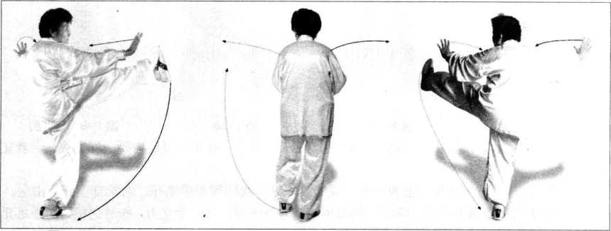 【动作】动作与右起脚相同,唯方向相反,左足落回原地时,足尖着地。又即将右足并身 体,微左转。眼往左边正面看去,式微停。(图1-81、图1-82)