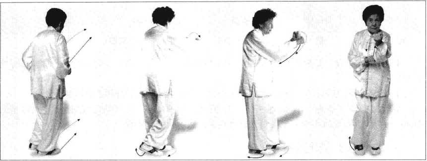 【动作】两拳变掌如划下弧线往下划去。分别划至两胯处,两手下垂。手心向里,左足同时 撤至右足处。两足里根相挨,仍还于起点90度之形式,身体同时往上起直。(图1-215)