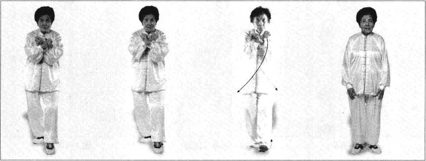 字形,左手里腕离心口 3~4寸许。两肘下垂,左足同时略前迈点步,足跟着地。(图1-210~图 1-214)