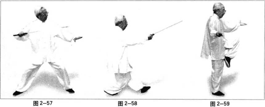 上势不停,两臂分开后,又迅速合拢,右手剑向前下方截去,左手心托住右手背,身体直立 起,重心在右脚,同时左脚抬起,脚面绷紧,脚心靠在右膝内上侧,成提膝独立步,身体稍前 探,胸腹略内涵,眼看剑身。(图2-60)