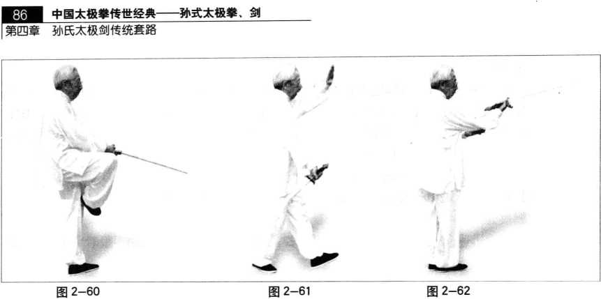 接前势,左脚以脚掌为轴向右扭,扭成与右脚成错综八字,脚跟落地,右脚随即向前迈出。 右手剑向里裹成老阳(手心斜向外),向上划一弧形撩去,手臂伸直,剑与肩平,左脚跟步,左 手剑指回到左额前上方,手心朝外,眼看剑尖。(图2-62)