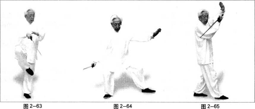 接前势,右手剑扭成老阴(手背斜向上),往上提剑,边提边向身体右侧由上往下划圆,高 不过头,右脚同时向右方落下,左手剑指在右手剑把往上提时,顺着右肋向下向左,势不停.继 续向左上划一圆圈,仍回到头左上侧,手心向外,这时右手剑未停,仍继续向下、向左、向上划 一圆圈,将剑托起,停在头左侧前方,持剑手成中阴中阳式(手心朝里),高与眼平,剑尖稍低。 右脚在剑托起时向左前方迈出与左脚平行,继续向左转半圆〔步数多少不拘,圈大步数自多,否 则步数自少〕当右脚在前时停住。眼看剑尖。(图2—64、图2-65)
