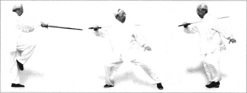 【要点】这一势是为要撩击从左侧来的进攻,因此眼要看左边,而不是眼随剑走。剑甩出时 要有崩劲。