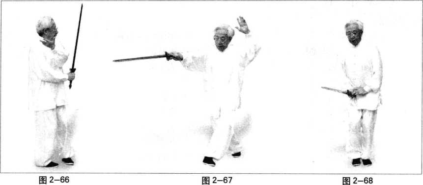 剑不停,从身体左侧向下、向右、再向上划一弧线,再向上反撩,虎口朝下,眼看剑身。同 时右脚后撤,两腿成剪子股势,脚掌着地,脚跟抬起。重心放在左腿。左手剑指与撩剑的同时, 向后划去,手心向上。(图2—67)