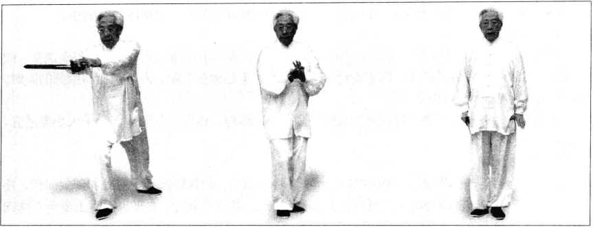 为中阴中阳(立剑),剑高与臂平,眼看剑尖。(图2—74、图2-75) 【要点】抽胯后坐,保持上体正直,否则上体易后仰。