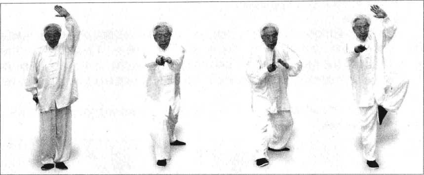 接前势,两胯后抽,身体向后坐,使重心由右腿移向左腿,右脚尖抬起,左手剑指仍扶于右 腕上,右手剑随抽胯的同时也向后抽剑,抽时使剑尖稍低,似划一立椭圆下半弧线,再向前刺 出,似划一立椭圆上半弧线,身体随剑向前探出,同时左脚提起,脚心扣在右膝内上侧,成提膝 独立步,左手剑指未动,只在右手剑后抽时,随右腕而向后移,右手剑无论是回抽还是刺出,皆