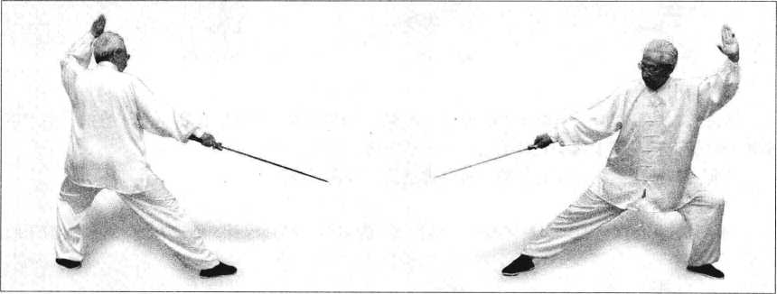 【要点】右手剑抽回,左剑指扶于右腕上与右脚上步停靠左踝处,均同时进行,须准确掌握 好动作时间的配合。其他要点同第15势。
