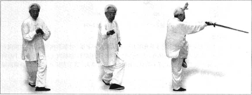 (2)剑不停,继续从右划下弧线至胸前,左手扶于右腕上,这时左脚迈向右脚左边。相距尺 许,两脚尖均向前,两腿微蹲如蹲裆势。