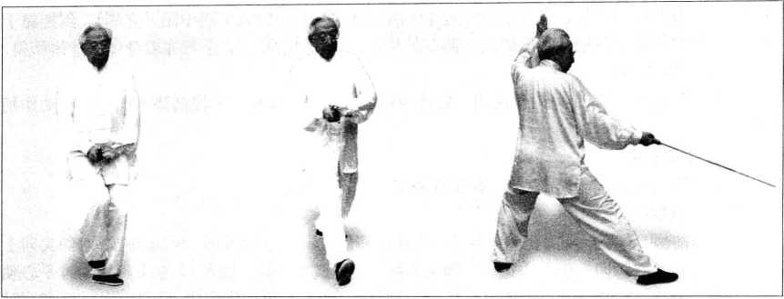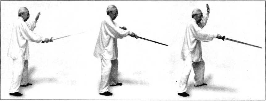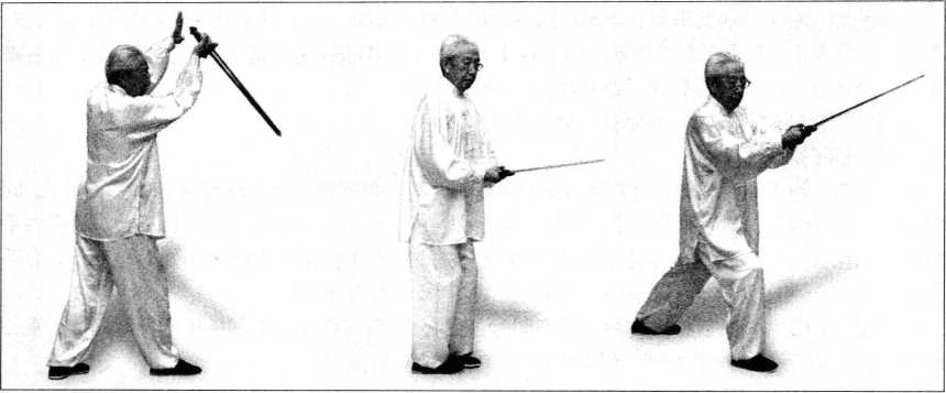 【要点】右脚向右前方迈出与右手剑先斜下向右刺出的时间和方向均相同。剑把上提时,注 意不要耸肩。
