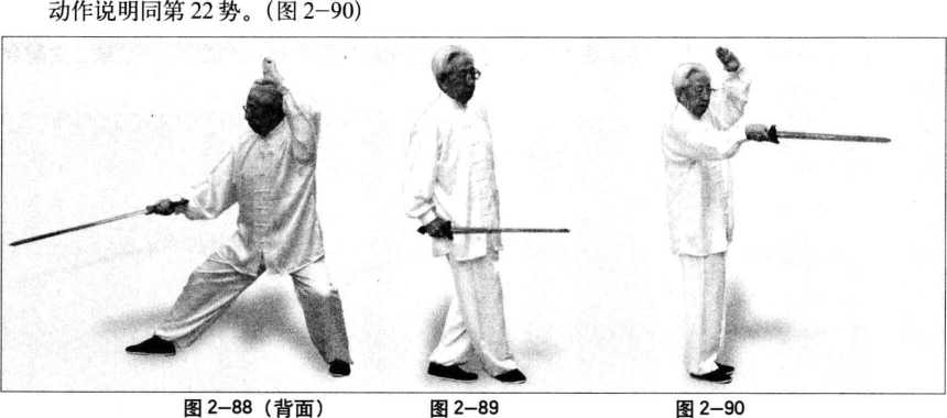 接前势,先将重心向右脚移,随即将左脚撤至右脚后面,以下动作说明均同第21势。唯方 向相反。(图2-89)