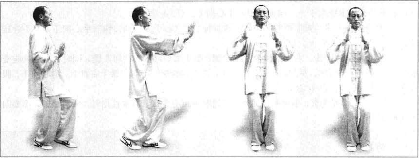 【要点】左脚上步右脚跟步要与两手前推协调一致,腰要塌住,两肩松开,外形虽微停,而 内中之意不可停。