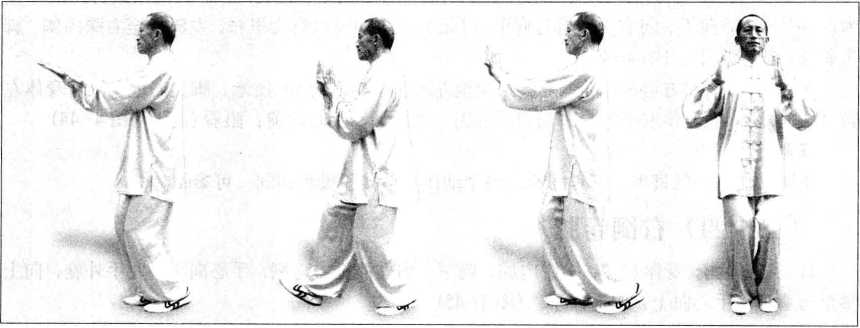 3 .随即左脚后撤,脚尖外摆,重心移向左腿,右脚尖翘起;同时,两手平着向右、向后划 一半圆至右肩前,手心向外。(图4—36)