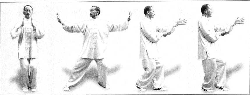 【要点】身体扭转要一气,劲要和平。其它动作要点与“(三)开手”相同。