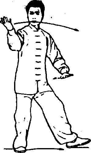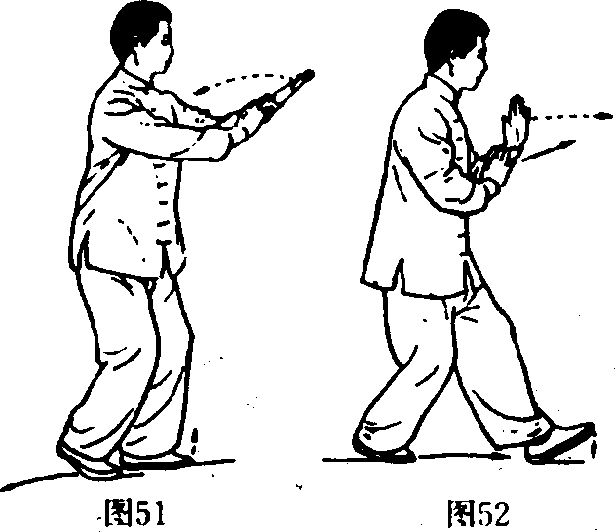 2-身体继续左转(胸向东);随体转右手经脸右 侧向前平着推出,臂微屈,塌腕立掌,手心向前,左手 继续搂至胯外侧,手心向下,指尖向前;同时右脚跟步 至左脚内踝侧,脚尖着地,重心移向左腿;眼看右手指 尖。(图48) *