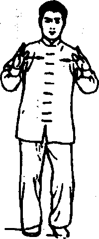 接上势,右脚跟里转,全脚踏实(脚尖向南),左脚 以脚跟为轴,脚尖右扣约90。着地,脚跟抬起;身体随 着右转(胸向南),重心偏向右腿洞时两手心相对,指 尖向上,向左右分开,两手虎口与肩相对,微停。(图 54)