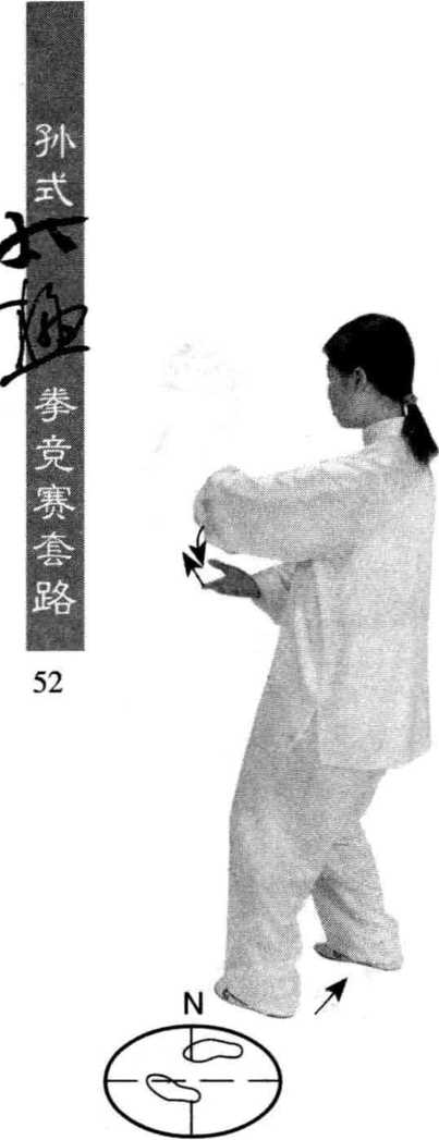 接前势。左脚尖稍内扣,重心 偏于左腿,右手稍下落,左手稍上 提,两手均举于胸部右前方,两臂 微屈,左手在右肘内侧,拇指侧均 向上;接着右脚向左后(东北)撤 步,重心移于右腿,左脚跟抬起,脚 尖着地;同时身体右转(胸向西 南),左手向左前(偏西南)伸出, 右手收至左肘内侧;眼看左手。