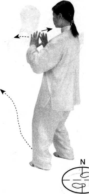 左脚尖内扣,脚尖着地 与右脚尖斜相对;身体微右 转(胸向西),重心偏于右腿; 随转体右手外旋,手心向上, 指尖向左;、左手内旋,手心向 下,指尖向右,两手心上下相 对约距1 0厘米合抱于胸前, 两手距胸约6厘米;眼看左 手。