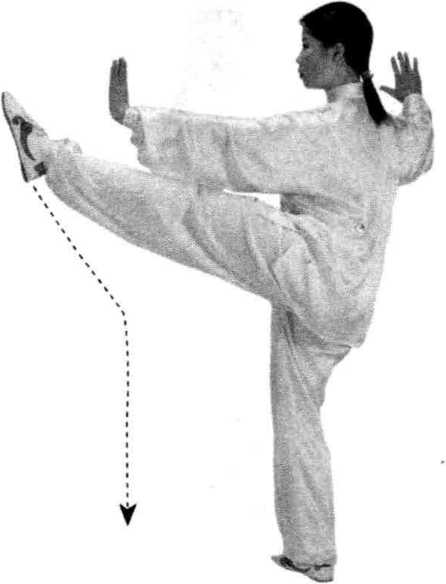 左腿屈膝微收,左脚向 左前下落,重心移向左腿;两 臂慢慢向下沉肘。