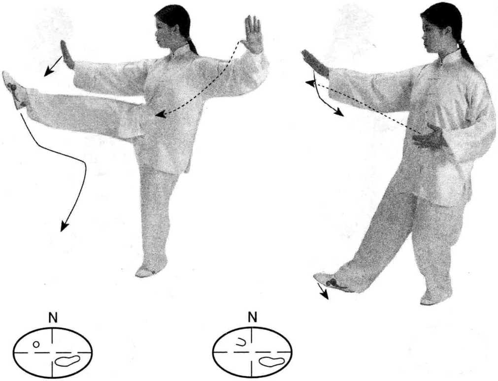 右腿微屈站稳,左膝提 左脚向左前、?向上(西南) 踢出,脚面自然展平,腿 ,“申直高过腰部,同时两 □ “单鞭势”分开,左手伸 E脚方向;眼看左手。