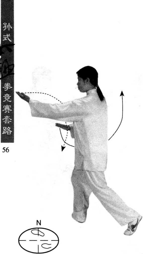 左脚向前上步,脚跟着 地,重心在右腿;上体右转 (胸向西北),随转体右手外 旋向下,经腹前向右、向上举 至与肩平,手心向上;左手内 旋向右经面前向下、向左划 弧搂至左胯旁,手心向下,指 尖向前,眼看右手。