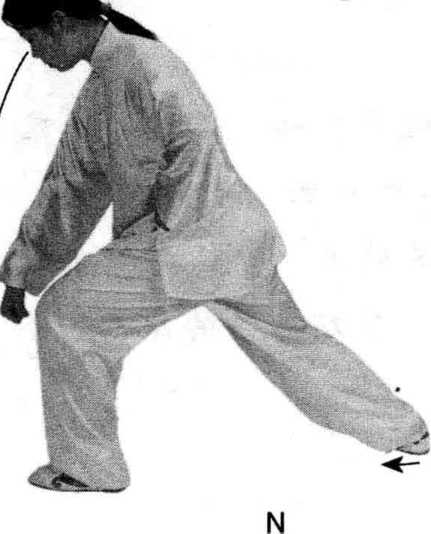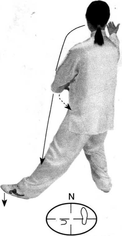 右腿屈膝微收,右脚向 右前(西)下落,脚跟着地, 左腿屈膝;同时右手随之向 下前伸,与胸同高,指尖向前 (西)手心向下,左手收至腹 前,手心向上,指尖向前,左 肘靠肋;眼看右手。