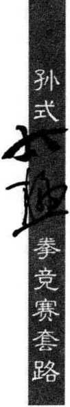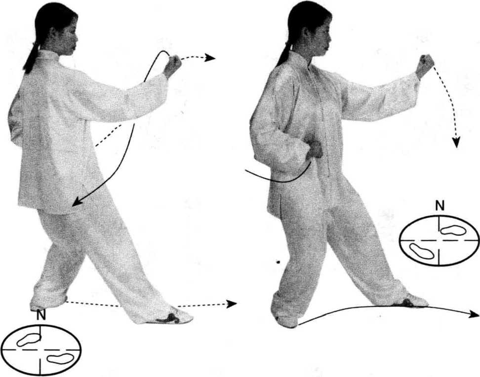 移向左腿并屈膝,成弓步,右 腿微屈;同时上体左转向前 倾身,右手握拳经右额向下、 向左内踝下击,拳眼向左,拳 面向下;左手握拳收至左胯 侧,拳眼向里;眼看右手。