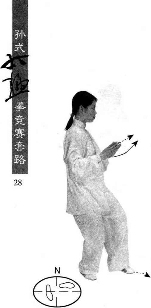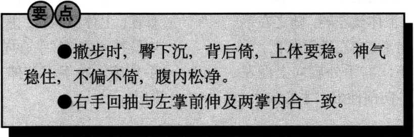 两手五指伸直,虎口向 上,左手向上、向前伸出,与 胸同高,右手后收至左前臂 内侧,两臂微屈;同时,右脚 向后撤步,先脚尖落地,随即 全脚掌落实,左脚后撤至右 脚前,脚尖着地,眼看前方。