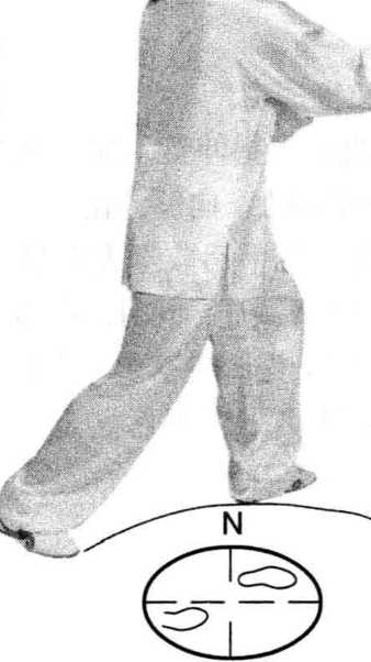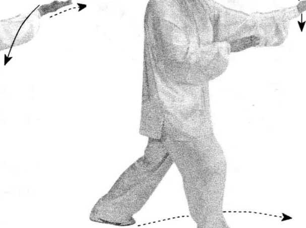 左脚向前迈出,脚尖稍 外摆;上体微左转,随之左手 内旋向下、向左搂至胸前,手 心向下;右手外旋向上经左 手下,向前伸出,手心向上。