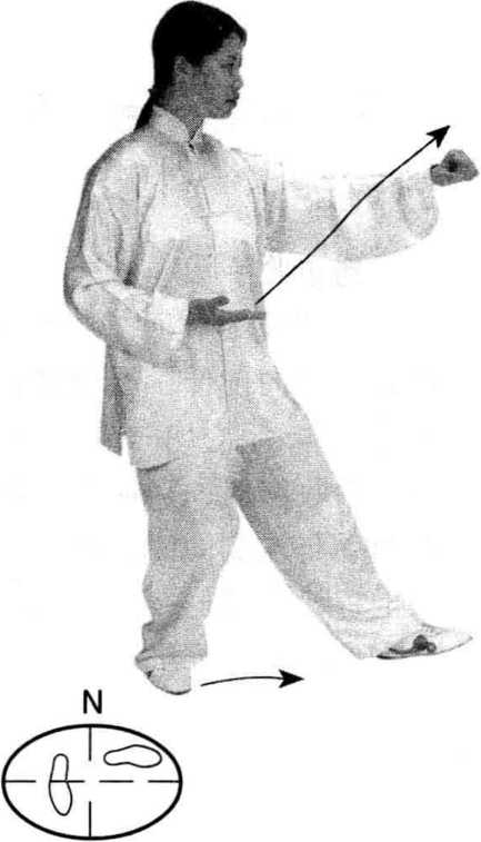 左脚向前上一步,右脚 跟步至左踝内侧,脚尖着地; 重心移向左腿;同时,右手外 旋变拳经左手腕上向前打出, 拳与胸平,拳眼向上;左手内 旋握拳屈臂,置于右肘下,拳 心向下,眼看右拳。