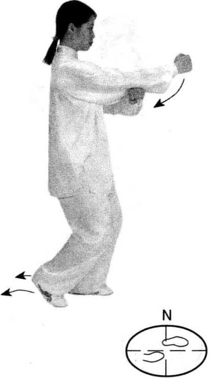 右脚向前上步,脚尖稍 外摆;上体微右转,随之右手 内旋搂回胸前,手心向下,左 手外旋经右手下前伸,手心 向上。